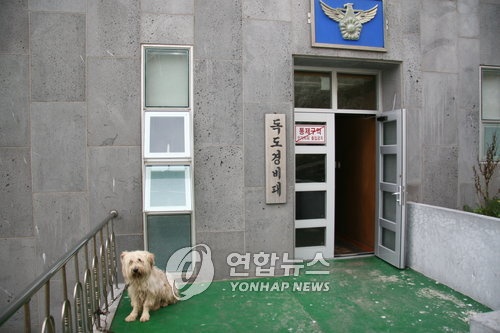 한 가운데 독도에 살고 있는 천연기념물 삽살개가 독도경비대 사무실 앞을 지키고 있다. 삽살개는 평소 풀어놓고 키우지만