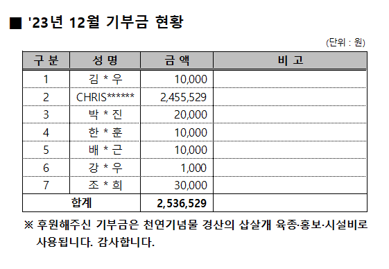 2023년 12월 기부금 현황 작성자:관리자 등록일:24-01-04 16:32 댓글:0건 조회수:771회 본문 목록 이전글 '24년 1월 기부금 현황 24.02.02 다음글 2023년 11월 기부금 현황 23.12.05 댓글목록 댓글목록 등록된 댓글이 없습니다.