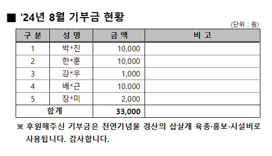 '24년 8월 기부금 현황 작성자:관리자 등록일:24-09-06 19:30 댓글:0건 조회수:762회 본문 목록 이전글 '24년 9월 기부금 현황 24.10.11 다음글 '24년 7월 기부금 현황 24.08.08 댓글목록 댓글목록 등록된 댓글이 없습니다.