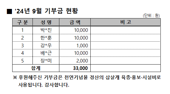 '24년 9월 기부금 현황 작성자:관리자 등록일:24-10-11 15:26 댓글:0건 조회수:735회 본문 목록 이전글 '24년 10월 기부금 현황 24.11.04 다음글 '24년 8월 기부금 현황 24.09.06 댓글목록 댓글목록 등록된 댓글이 없습니다.