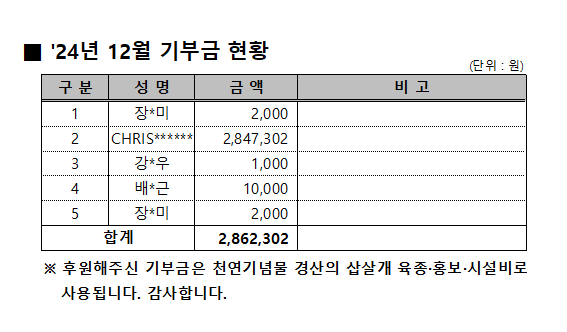 '24년 12월 기부금 현황 작성자:관리자 등록일:25-01-08 10:25 댓글:0건 조회수:709회 본문 목록 이전글 '25년 1월 기부금 현황 25.02.04 다음글 '24년 11월 기부금 현황 24.12.05 댓글목록 댓글목록 등록된 댓글이 없습니다.