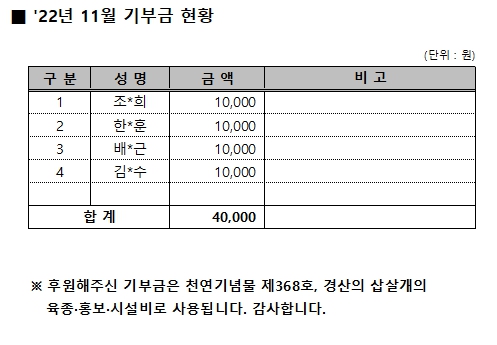 2022년 11월 기부금 현황 작성자:관리자 등록일:22-12-01 16:11 댓글:0건 조회수:902회 본문 목록 이전글 2022년 12월 기부금 현황 23.01.02 다음글 2022년 10월 기부금 현황 22.11.01 댓글목록 댓글목록 등록된 댓글이 없습니다.