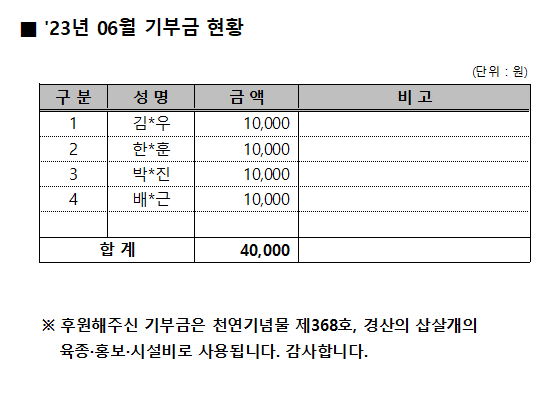 2023년 06월 기부금 현황 작성자:관리자 등록일:23-07-04 17:46 댓글:0건 조회수:789회 본문 목록 이전글 2023년 07월 기부금 현황 23.08.01 다음글 2023년 05월 기부금 현황 23.06.07 댓글목록 댓글목록 등록된 댓글이 없습니다.