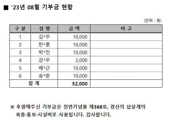 2023년 08월 기부금 현황 작성자:관리자 등록일:23-09-06 09:13 댓글:0건 조회수:811회 본문 목록 이전글 2023년 09월 기부금 현황 23.10.06 다음글 2023년 07월 기부금 현황 23.08.01 댓글목록 댓글목록 등록된 댓글이 없습니다.