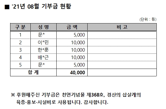 2021년 08월 기부금 현황 작성자:관리자 등록일:21-09-06 14:29 댓글:0건 조회수:2,467회 본문 목록 이전글 2021년 09월 기부금 현황 21.10.05 다음글 2021년 07월 기부금 현황 21.08.06 댓글목록 댓글목록 등록된 댓글이 없습니다.