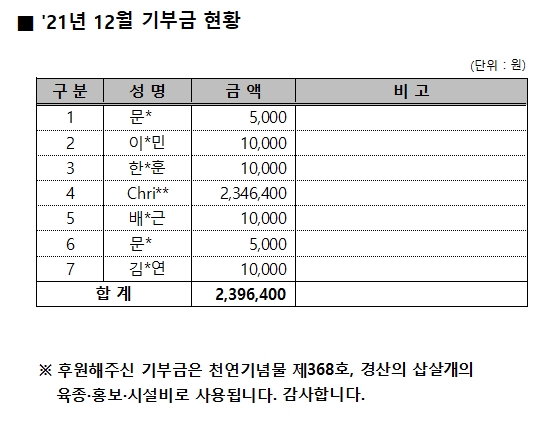 2021년 12월 기부금 현황 작성자:관리자 등록일:22-01-04 15:07 댓글:0건 조회수:1,526회 본문 목록 이전글 2022년 01월 기부금 현황 22.02.03 다음글 2021년 11월 기부금 현황 21.12.01 댓글목록 댓글목록 등록된 댓글이 없습니다.