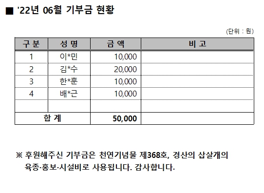 2022년 06월 기부금 현황 작성자:관리자 등록일:22-07-04 09:54 댓글:0건 조회수:1,017회 본문 목록 이전글 2022년 07월 기부금 현황 22.08.02 다음글 2022년 05월 기부금 현황 22.06.03 댓글목록 댓글목록 등록된 댓글이 없습니다.