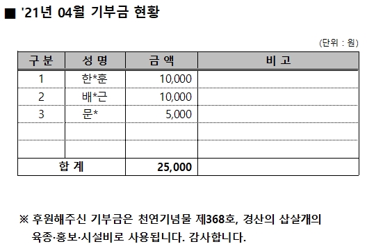 2021년 04월 기부금 현황 작성자:관리자 등록일:21-05-04 18:29 댓글:0건 조회수:3,209회 본문 목록 이전글 2021년 05월 기부금 현황 21.06.01 다음글 2021년 03월 기부금 현황 21.04.01 댓글목록 댓글목록 등록된 댓글이 없습니다.