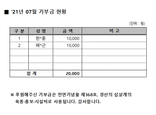 2021년 07월 기부금 현황 작성자:관리자 등록일:21-08-06 10:27 댓글:0건 조회수:2,637회 본문 목록 이전글 2021년 08월 기부금 현황 21.09.06 다음글 2021년 06월 기부금 현황 21.07.01 댓글목록 댓글목록 등록된 댓글이 없습니다.