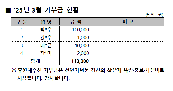 '25년 3월 기부금 현황 작성자:관리자 등록일:25-04-01 17:03 댓글:0건 조회수:657회 본문 목록 이전글 '24년도 기부금 기탁액 및 활용실적 25.04.02 다음글 '25년 2월 기부금 현황 25.03.04 댓글목록 댓글목록 등록된 댓글이 없습니다.