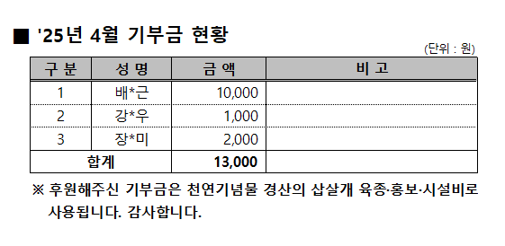 '25년 4월 기부금 현황 작성자:관리자 등록일:25-05-02 14:44 댓글:0건 조회수:692회 본문 목록 이전글 '25년 5월 기부금 현황 25.06.04 다음글 '24년도 기부금 기탁액 및 활용실적 25.04.02 댓글목록 댓글목록 등록된 댓글이 없습니다.
