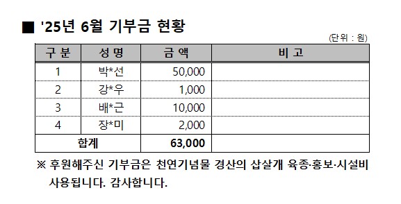 '25년 6월 기부금 현황 작성자:관리자 등록일:25-07-01 13:55 댓글:0건 조회수:715회 본문 목록 이전글 '25년 7월 기부금 현황 25.08.04 다음글 '25년 5월 기부금 현황 25.06.04 댓글목록 댓글목록 등록된 댓글이 없습니다.