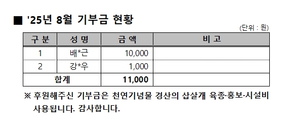 '25년 8월 기부금 현황 작성자:관리자 등록일:25-09-01 14:16 댓글:0건 조회수:525회 본문 목록 이전글 '25년 9월 기부금 현황 25.10.13 다음글 '25년 7월 기부금 현황 25.08.04 댓글목록 댓글목록 등록된 댓글이 없습니다.