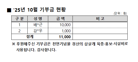 '25년 10월 기부금 현황 작성자:관리자 등록일:25-11-03 15:33 댓글:0건 조회수:473회 본문 목록 이전글 '25년 11월 기부금 현황 25.12.01 다음글 '25년 9월 기부금 현황 25.10.13 댓글목록 댓글목록 등록된 댓글이 없습니다.