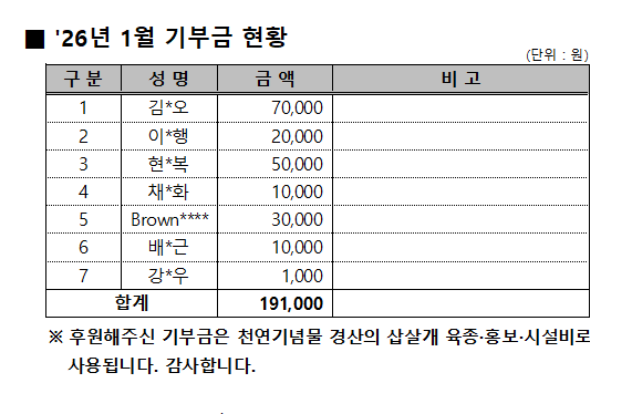 '26년 1월 기부금 현황 작성자:관리자 등록일:26-02-03 18:08 댓글:0건 조회수:180회 본문 목록 이전글 '26년 2월 기부금 현황 26.03.03 다음글 '25년 12월 기부금 현황 26.01.06 댓글목록 댓글목록 등록된 댓글이 없습니다.