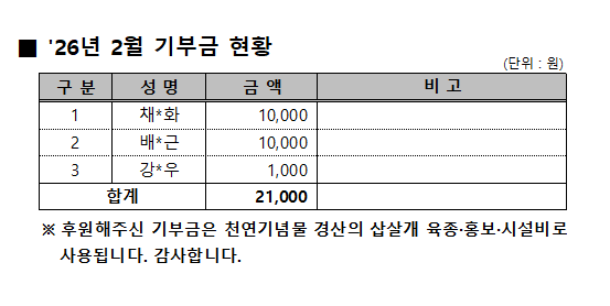 '26년 2월 기부금 현황 작성자:관리자 등록일:26-03-03 16:11 댓글:0건 조회수:108회 본문 목록 이전글 '26년 3월 기부금 현황 26.04.02 다음글 '26년 1월 기부금 현황 26.02.03 댓글목록 댓글목록 등록된 댓글이 없습니다.
