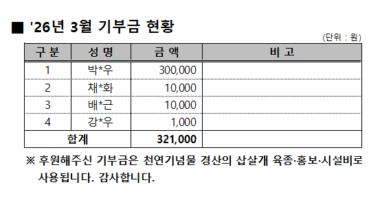 '26년 3월 기부금 현황 작성자:관리자 등록일:26-04-02 15:49 댓글:0건 조회수:45회 본문 목록 다음글 '26년 2월 기부금 현황 26.03.03 댓글목록 댓글목록 등록된 댓글이 없습니다.